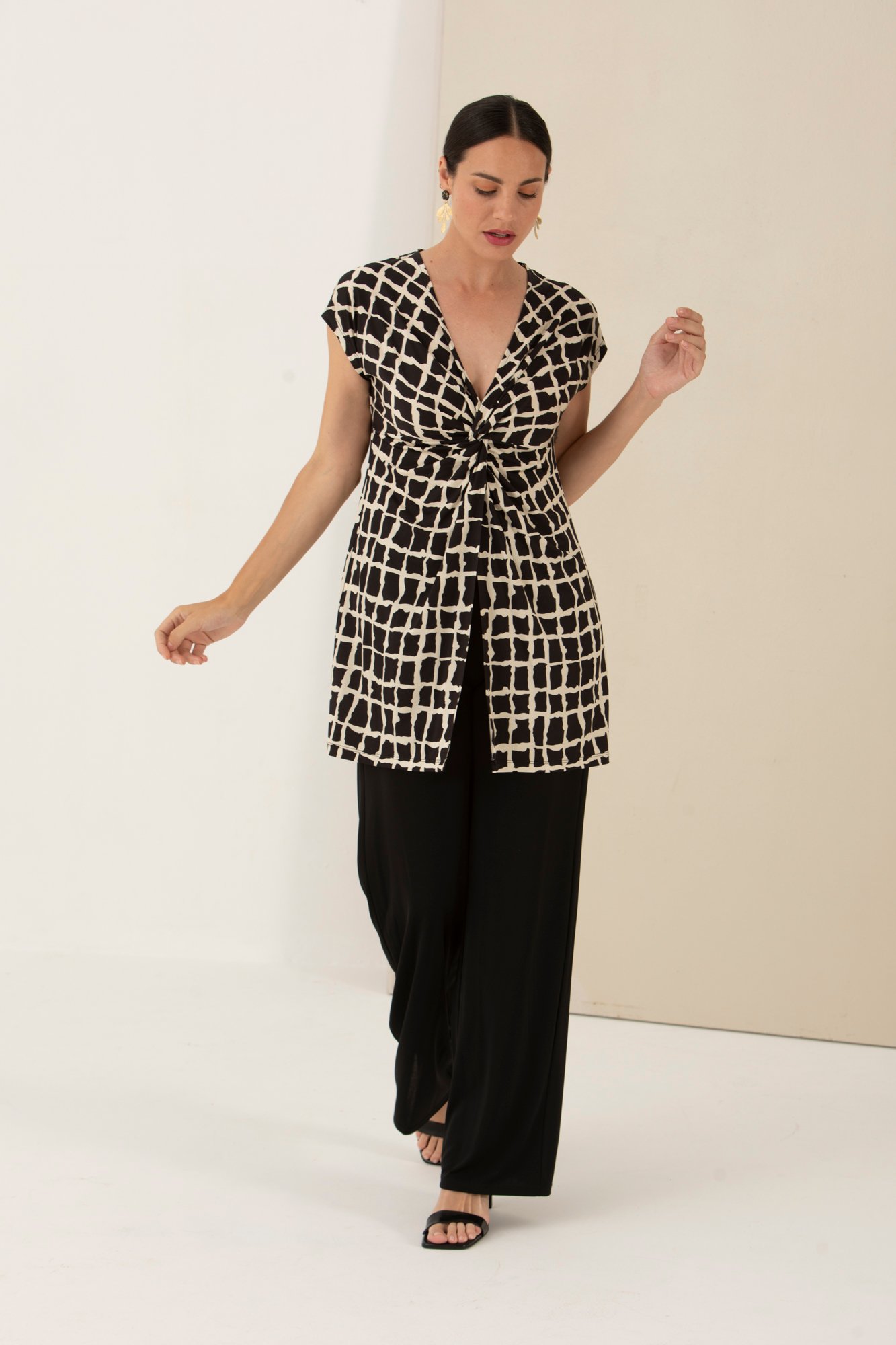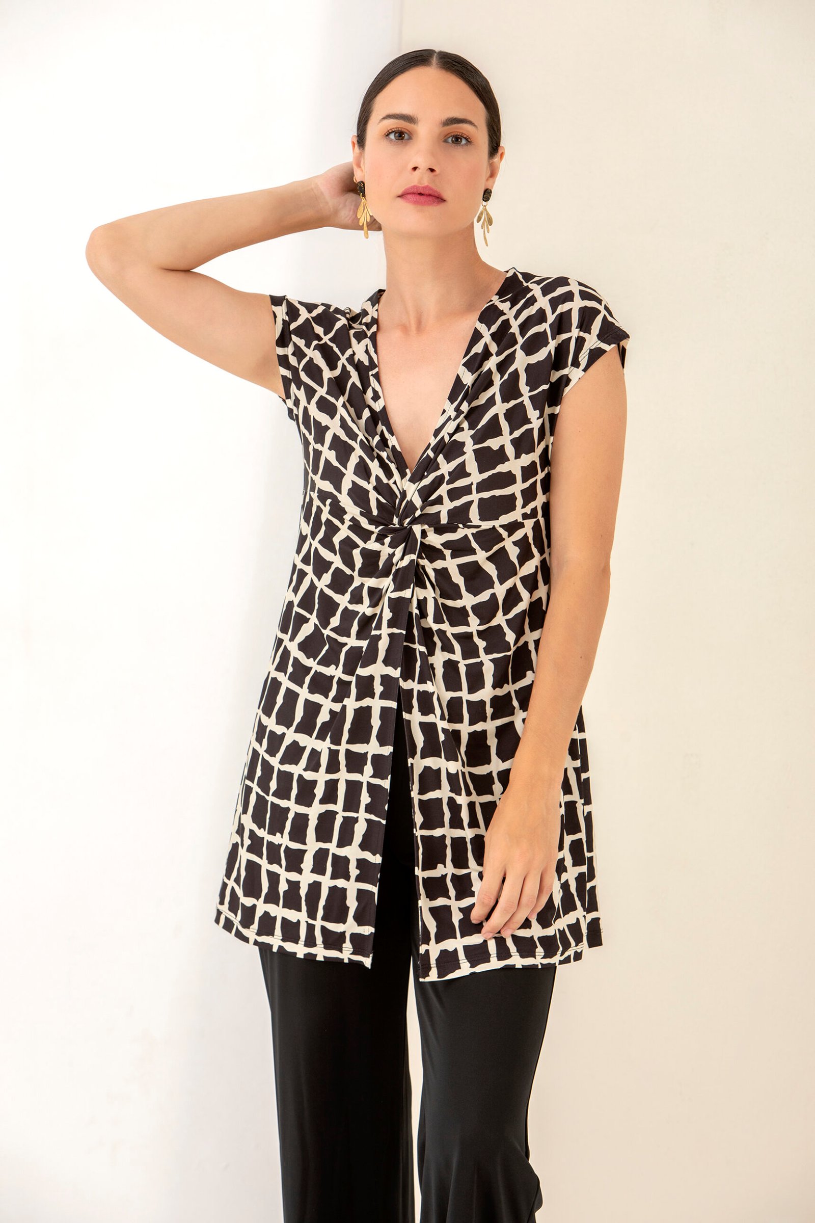 Blusa larga abierta delante con escote en pico y fruncido nudo en el pecho. Estampado beige y negro. Manga caída.