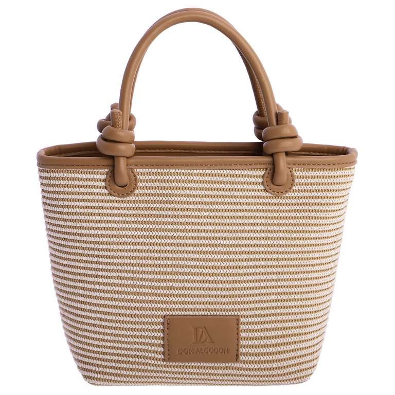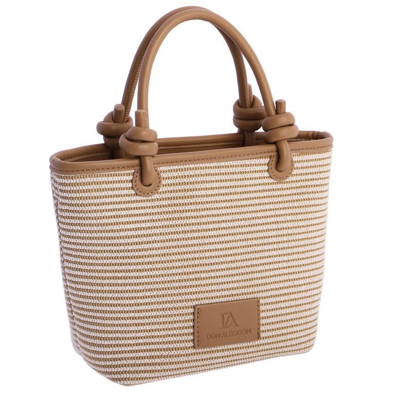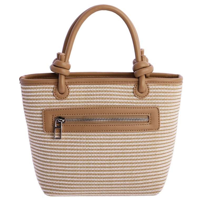 Bolso de mano con bandolera larga regulable en color natural con estampado rayado en crudo.