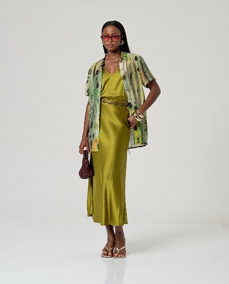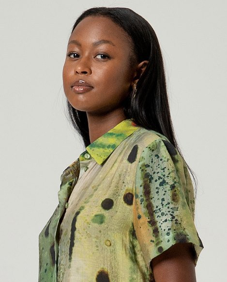 Camisa larga estampada en verdes. Cuello camiseto con botones.