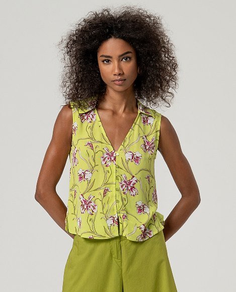 Camisa sin mangas con escote pico y cierre frontal de botones. Estampado y corte recto con bajo  redondeado. Confeccionada en tejido ligero con caída fluida.