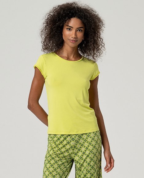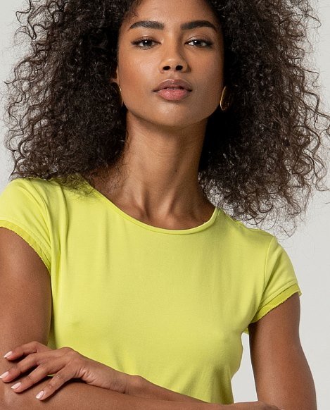 Camiseta de cuello redondo y manga corta tipo casquillo con detalle de doble vivo a tono. Diseño de silueta entallada y corte recto a la cadera con acabado de pespuntes sencillos. Confeccionada en tejido de viscosa de bambú y elastano de tacto suave.