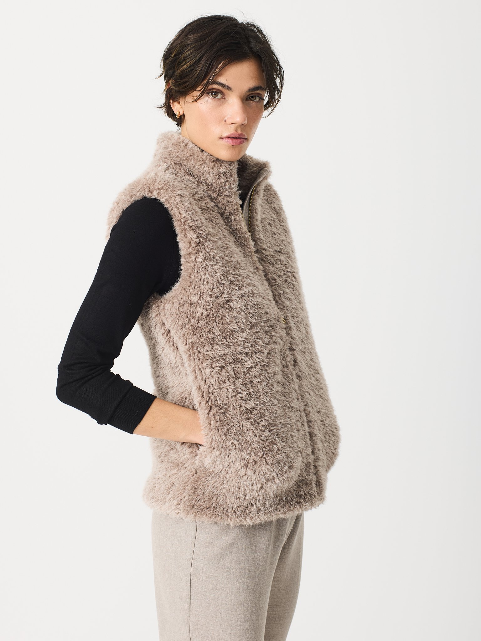 Chaleco con cremallera y cuello chimenea.Este chaleco esta confeccionado en un material de alta calidad que imita la textura y suavidad d la piel. El chaleco tiene una apariencia suave, esponjosa y aterciopelada al tacto. El tono beige, cálido y neutro