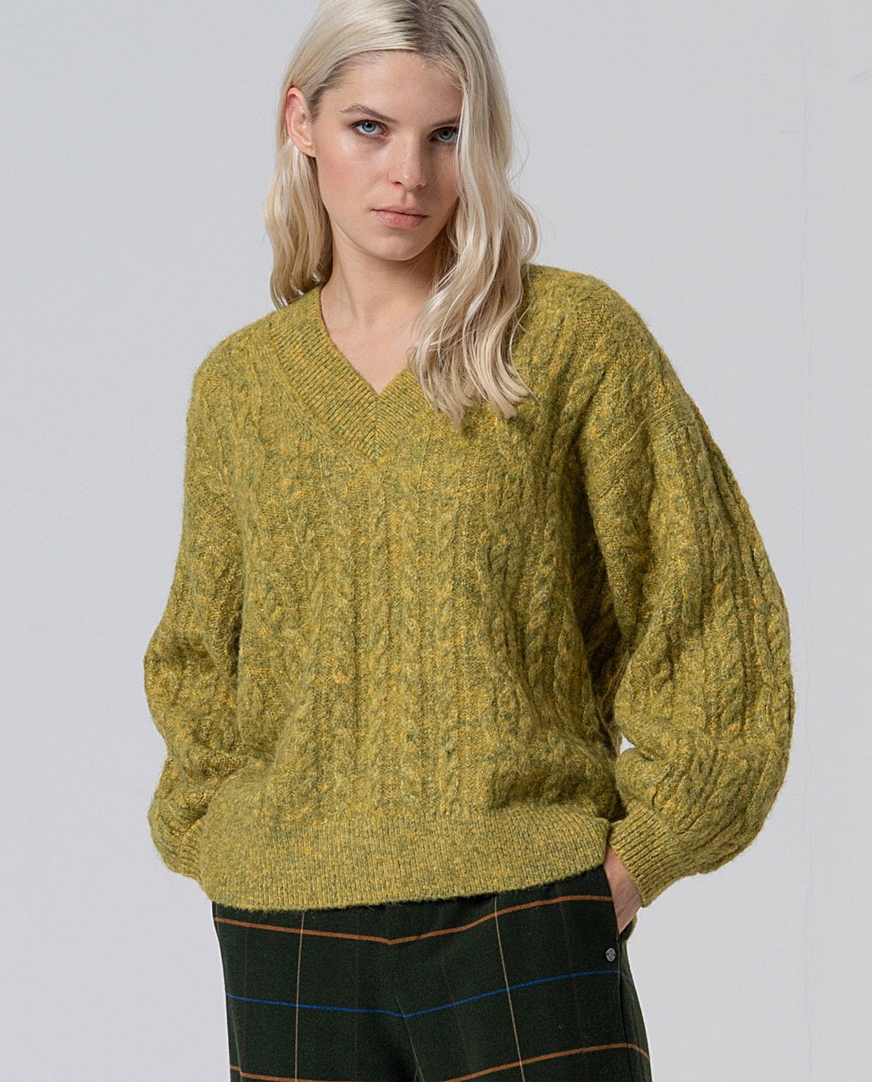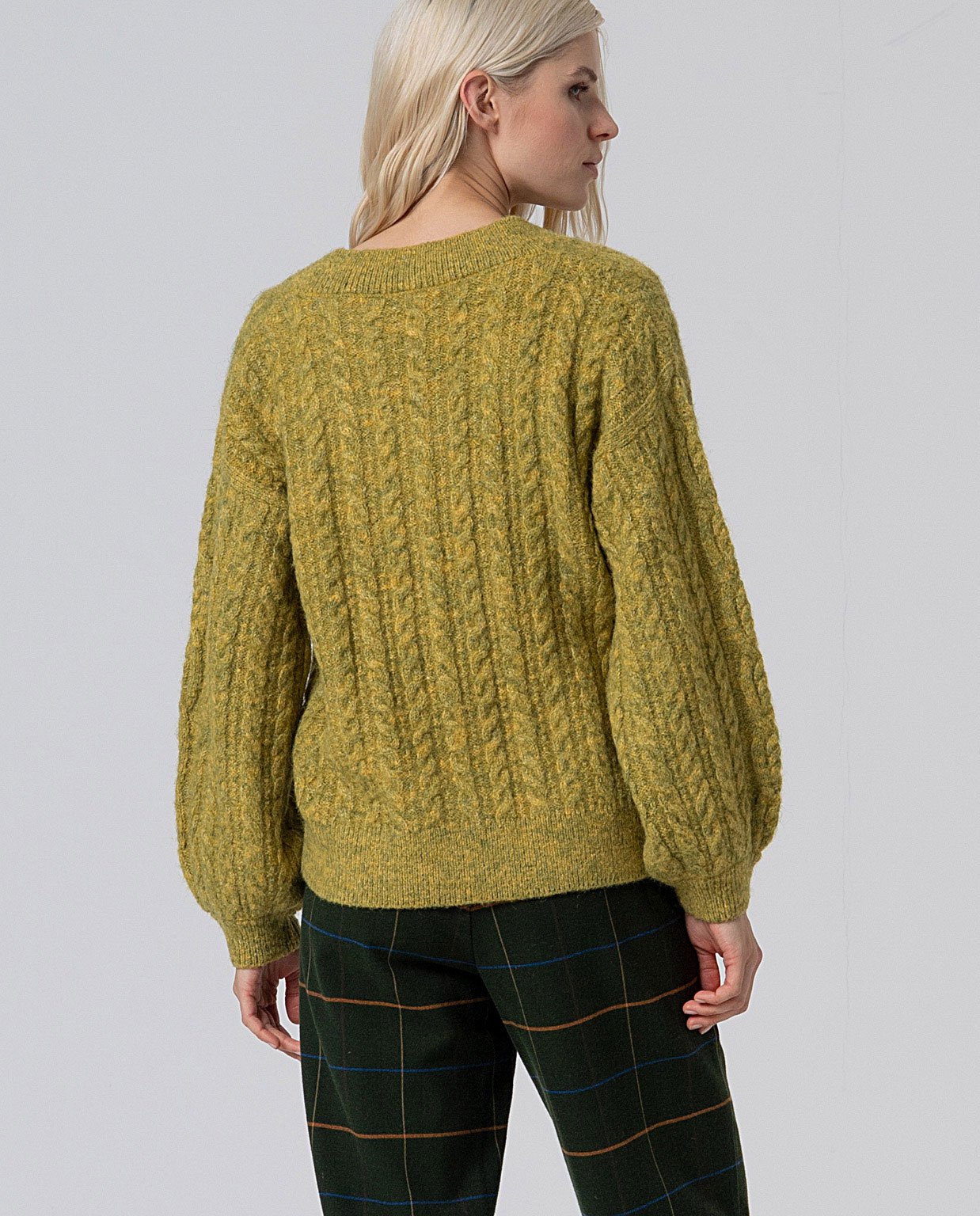 Jersey amplio con nudos tejidos en vertical. Escote en pico. Color kaki. Mangas abullonadas con puño.