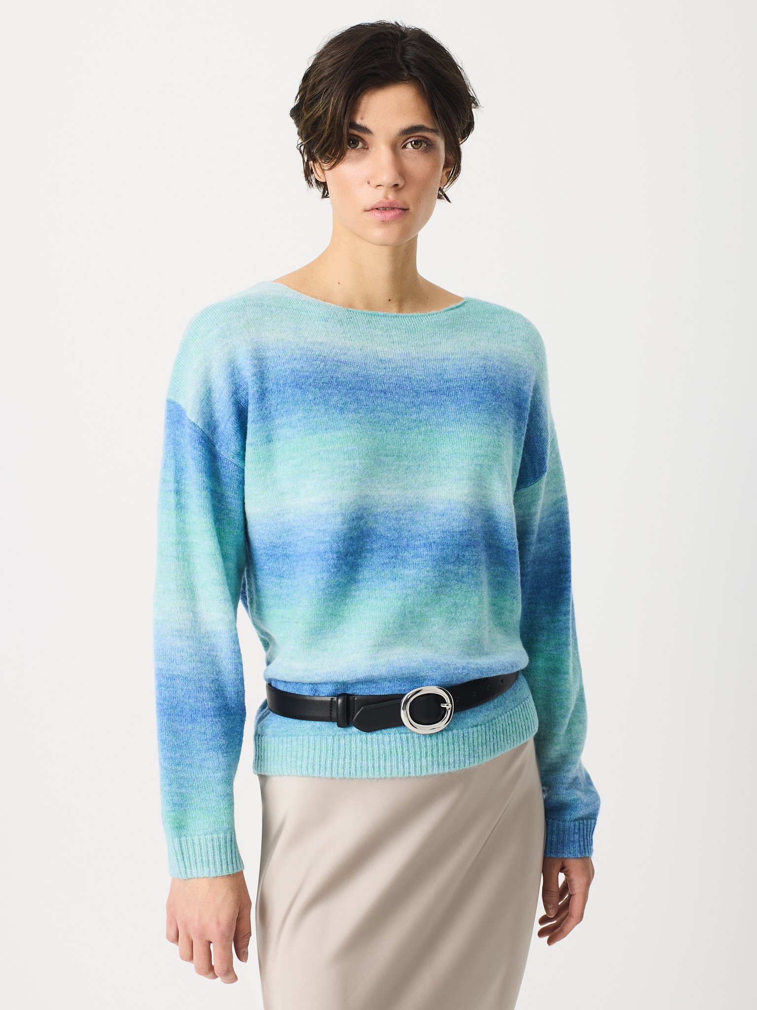 Jersey escote barca en colores azules.