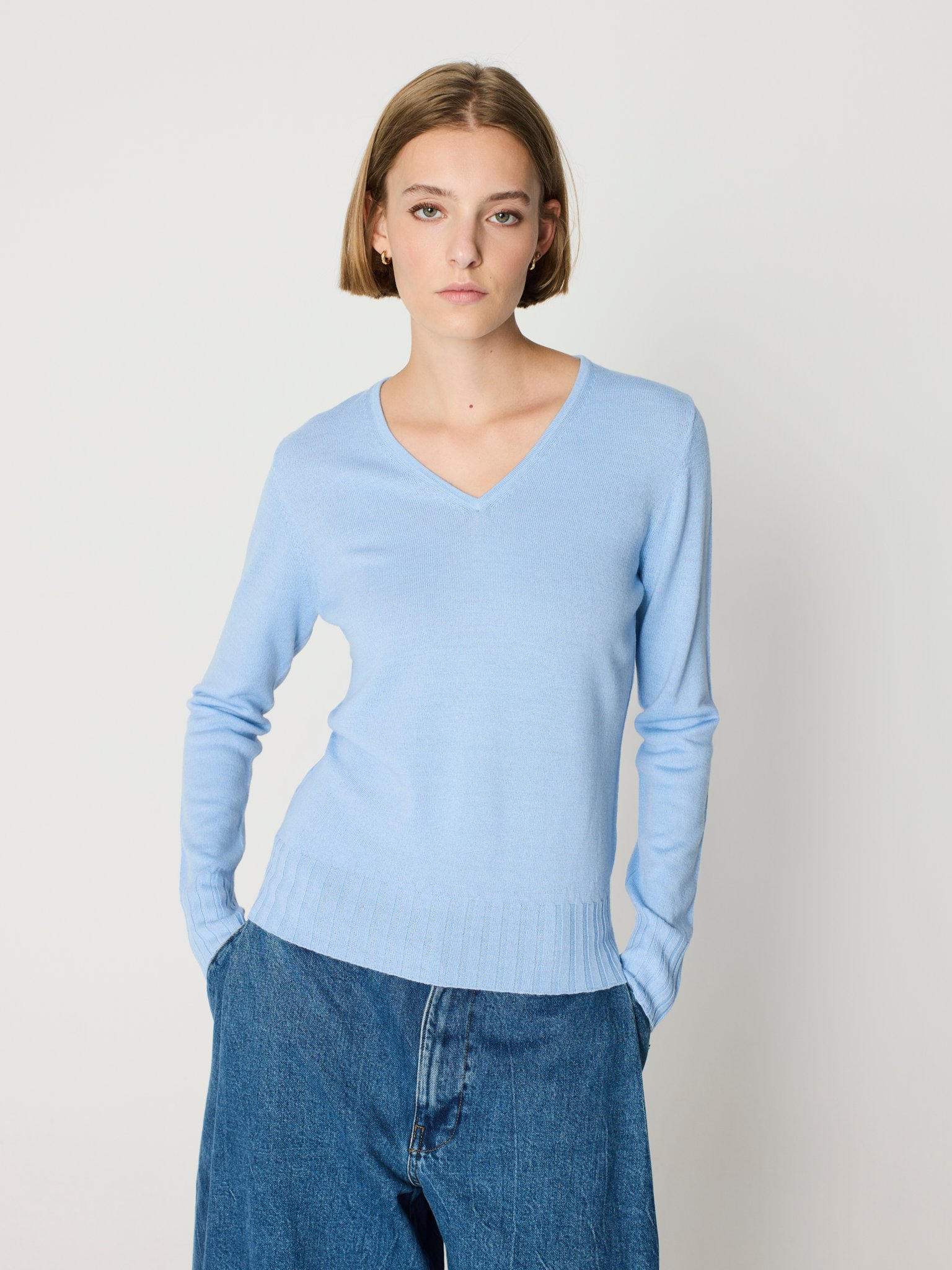 Suéter escote pico azul claro.