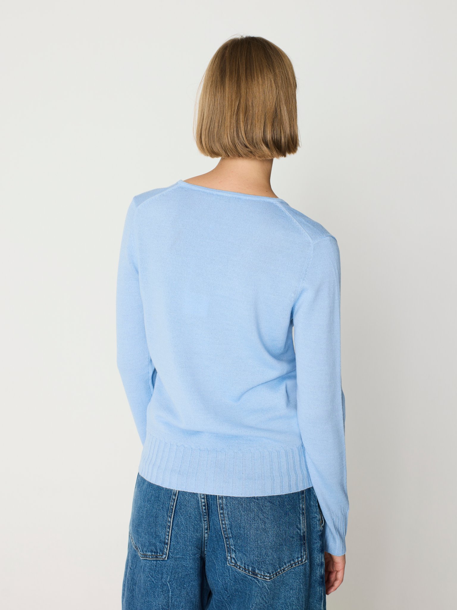 Jersey con lana en color azul claro.Estote en pico.