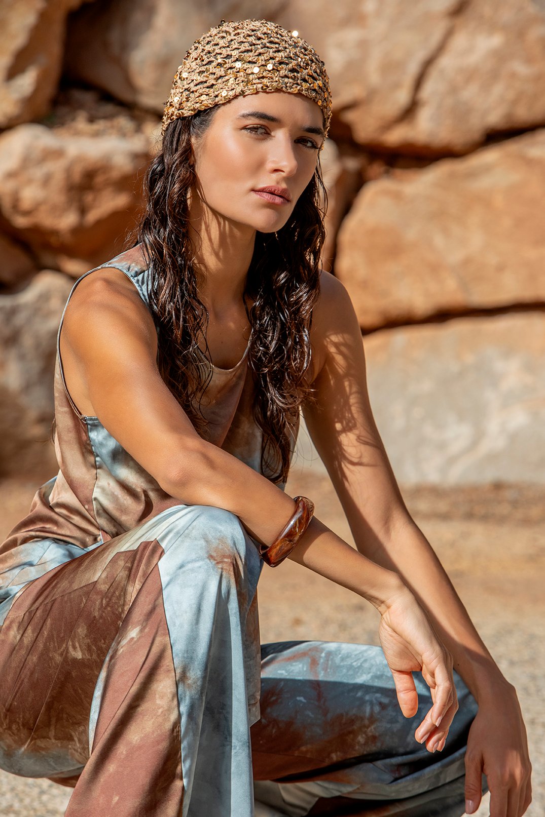 Top de punto anudado en la cintura con cuello redondo. Estampado «manchado difuminado» en tonos marrones y azules.
